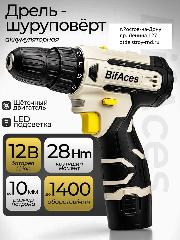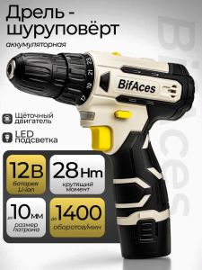 Аккумуляторная дрель-шуруповерт BifAces DBED-12A с батареей Li-Ion 12 В и максимальным крутящим моментом в 28 Н·м , предназначена для монтажа и демонтажа резьбовых соединений, сверления отверстий в металле, древесине, пластмассе и других материалах. Имеет бесщёточный двигатель с ёмкостью аккумулятора 1,3 А·ч, быстрозажимной патрон до 10 мм. а также максимальную скорость вращения до 1400 об/мин. Надежный литий-ионный аккумулятор без эффекта памяти обеспечивает долгий срок службы инструмента. Дрель не зависит от сети питания, что делает удобной работу на строительных объектах, на высоте и в отдаленных участках дома. Корпус оснащён обрезинненой рукояткой, подсветкой для работы при тёмном освещении, реверсом.
