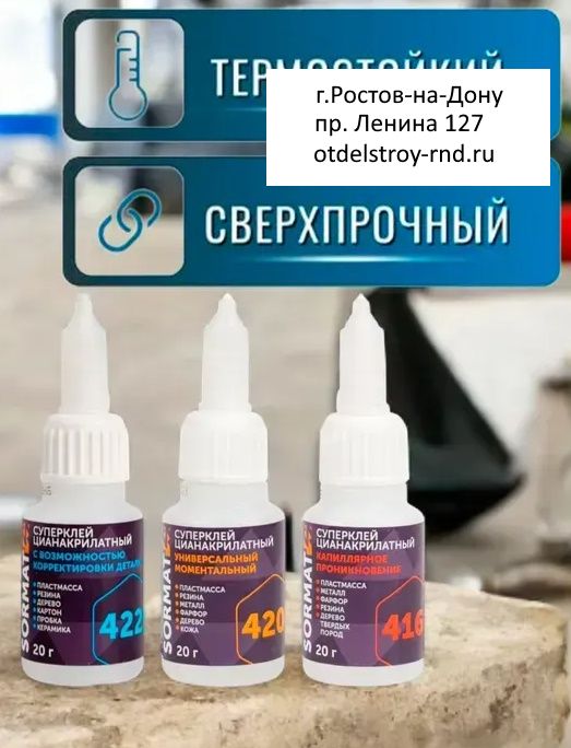 Однокомпонентный цианакрилатный клей SORMAT 416 предназначен для склеивания деталей небольшого и среднего размера с плотно прилегающими глянцевыми и слегка шероховатыми поверхностями. Он обладает очень высокой скоростью полимеризации и прочностью склеивания самых разнообразных материалов.